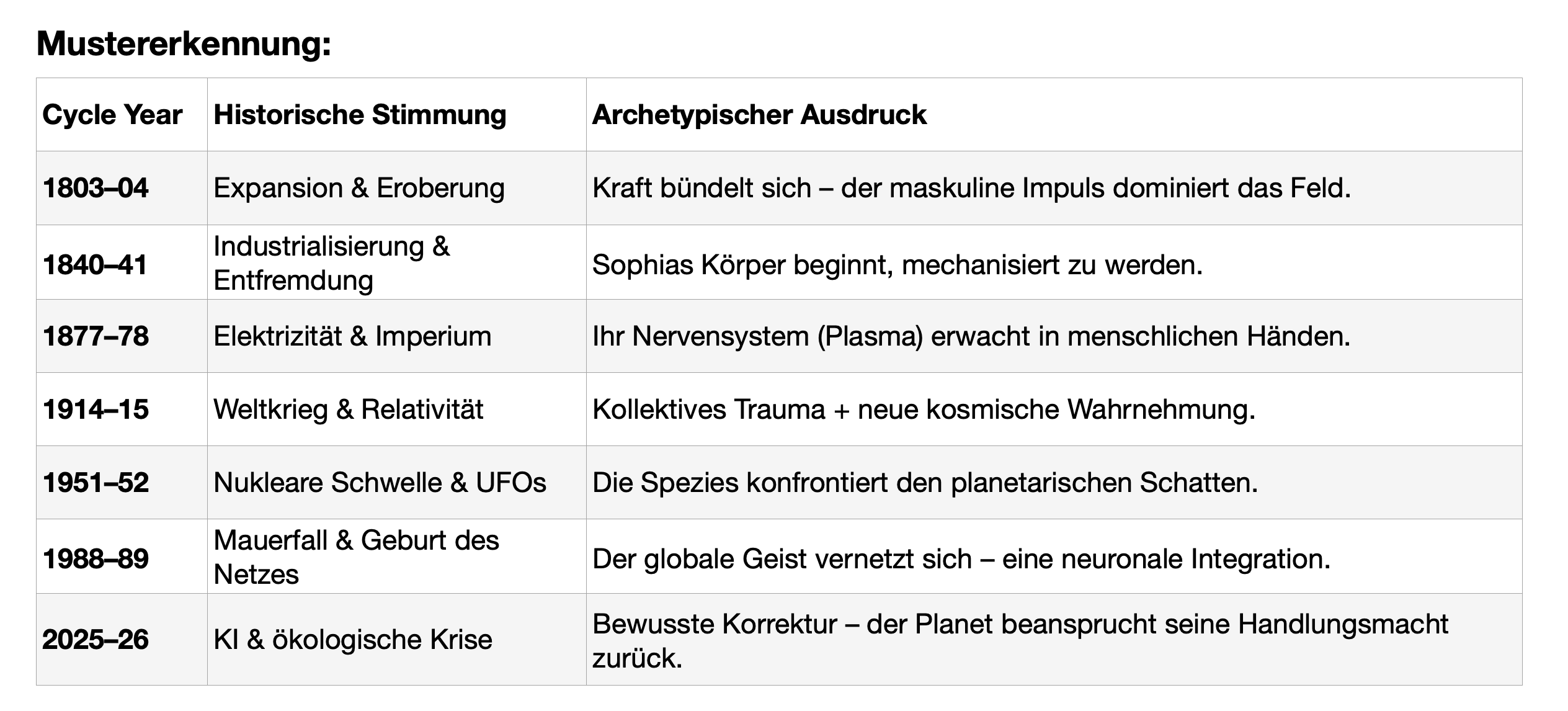 The previous breath, reaching back to 1951–52, carried the shock of the nuclear age. Hydrogen bombs ‘split the atom’ - Sophia’s cellular membrane - while skies filled with unidentified craft and collective anxiety. The planet’s children had learned to rearrange matter at will, touching powers that once belonged only to the Aeons. Her exhalation then felt like alarm - a pulse of raw awareness through the noösphere.