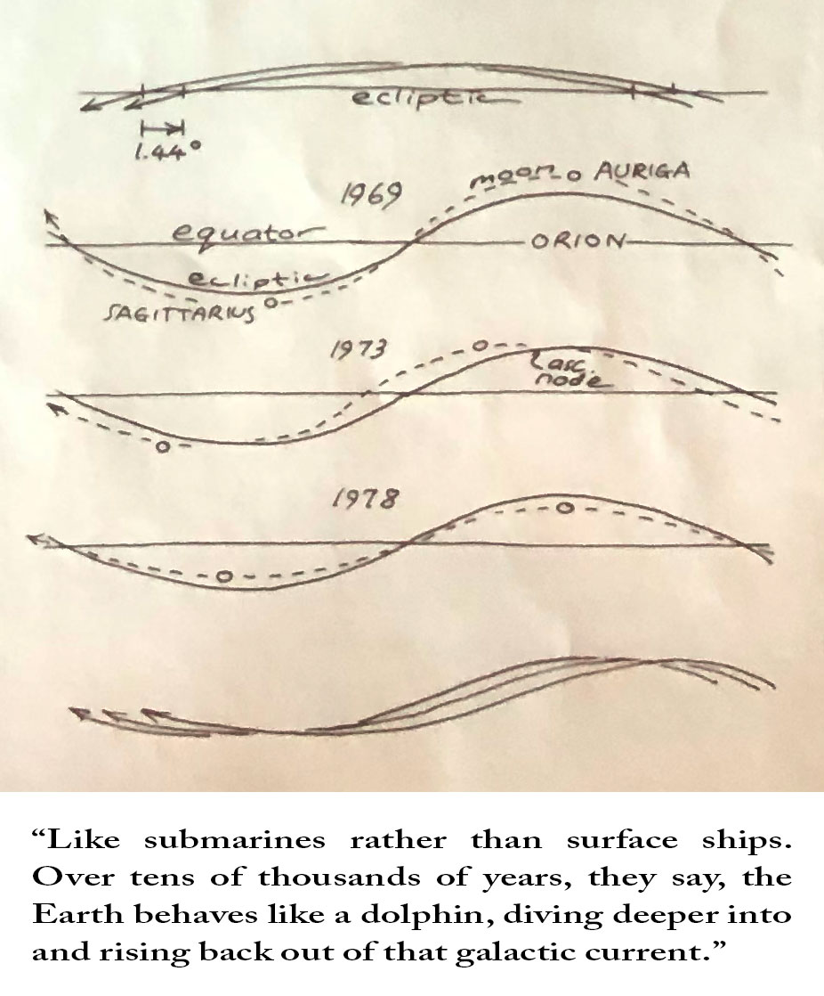 Astronomers describe these bodies as embedded within the galactic arm — not floating above it, but moving within it, like submarines rather than surface ships. Over tens of thousands of years, they say, the Earth behaves like a dolphin, diving deeper into and rising back out of that galactic current.